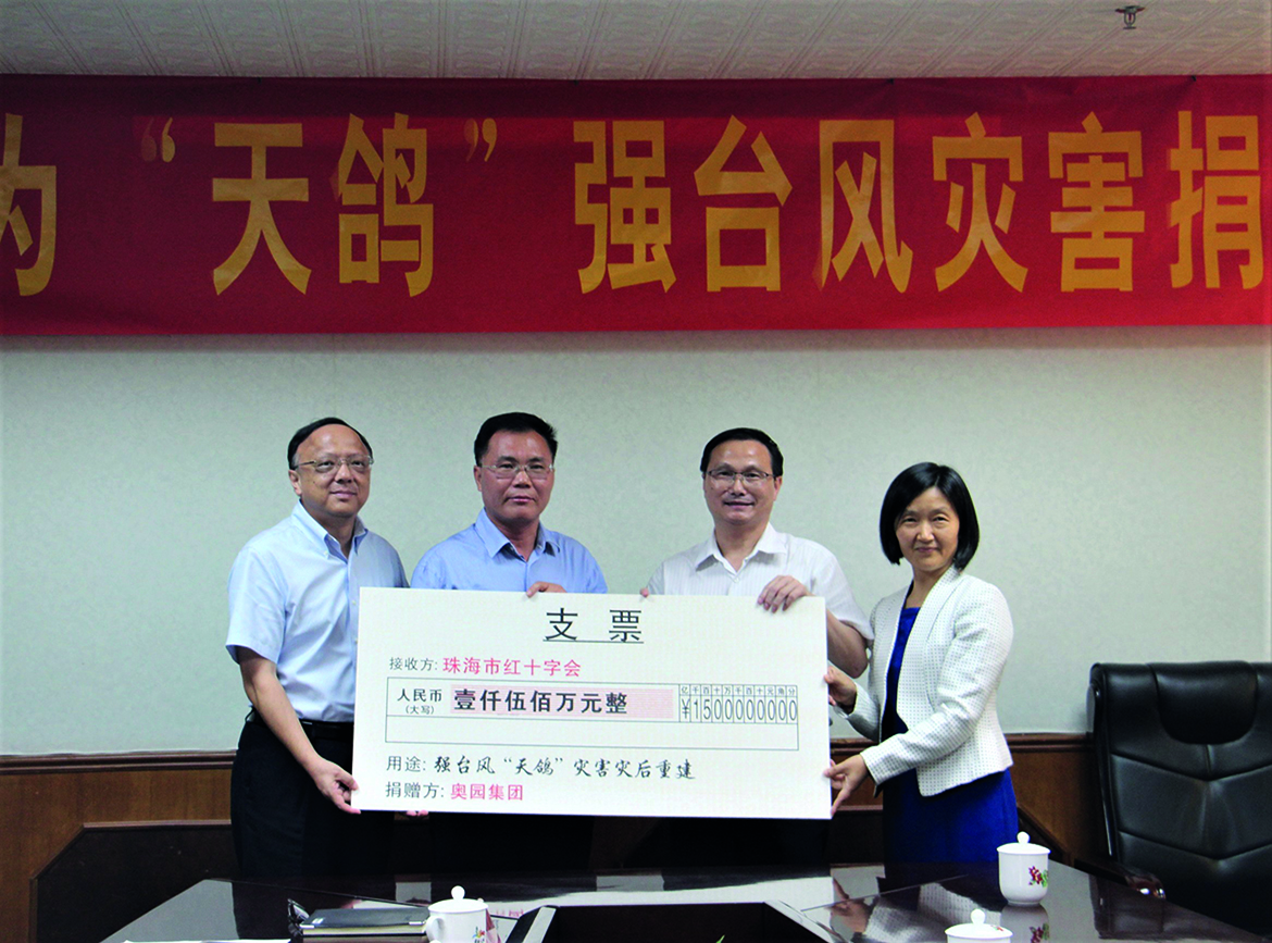 2017年,中國奧園集團為珠海“天鴿”強臺風災后重建捐贈1500萬