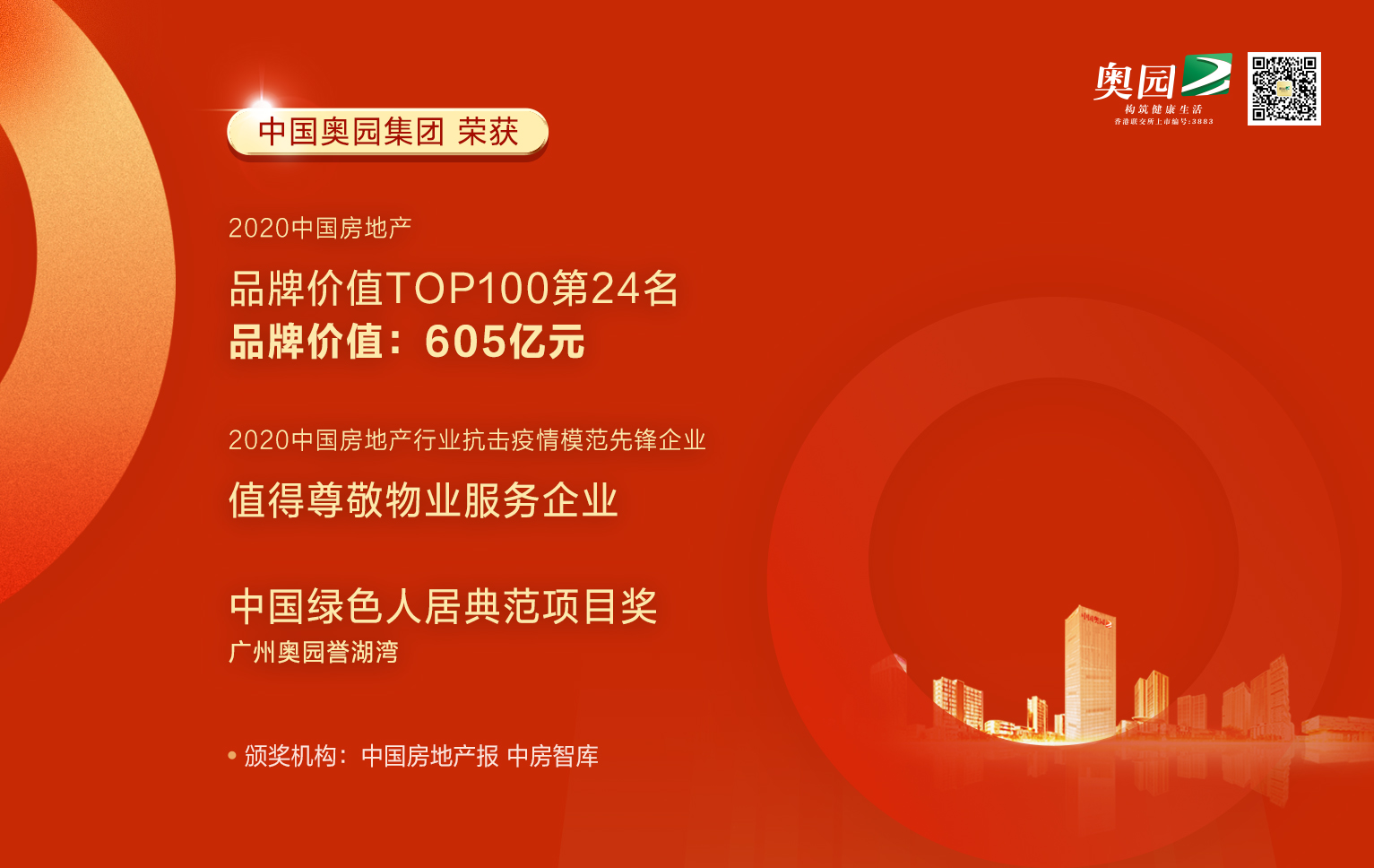 7月31日,中國房地產報主辦的“2020中國房地產品牌大會”順利召開。憑借突出的品牌力、產品力和高度的社會責任感,中國奧園榮列“2020中國房地產品牌價值TOP100”第24名,品牌價值達605億元;榮獲“2020中國房地產行業抗擊疫情模范先鋒企業 值得尊敬物業服務企業”稱號;旗下項目廣州奧園譽湖灣摘得“中國綠色人居典范項目獎”。