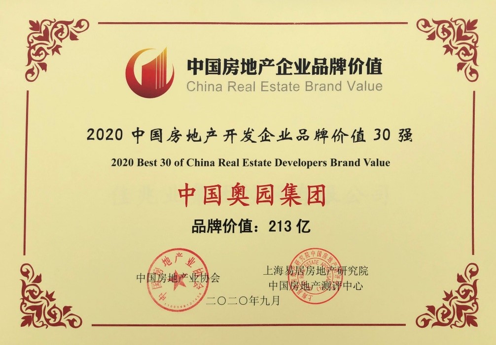 9月17日,由中國房地產業協會、上海易居房地產研究院中國房地產測評中心聯合主辦的“2020中國房地產企業品牌價值測評成果發布會暨房地產品牌發展高峰論壇”在上海舉行,中國奧園集團榮膺“2020中國房地產開發企業品牌價值30強”“2020中國商業地產企業品牌價值10強”。
