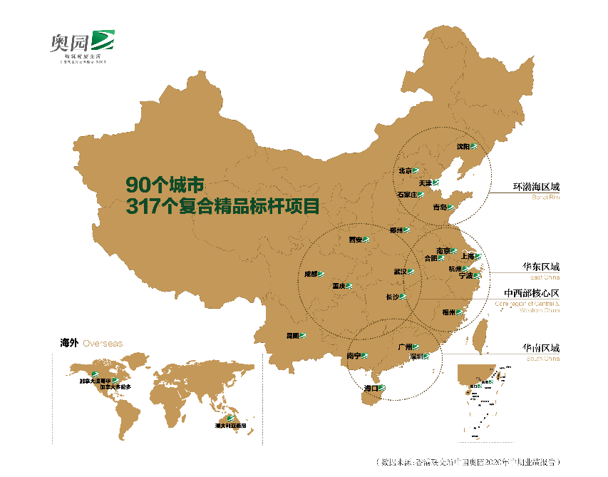截至2020年6月30日,中國奧園在90個城市匠心筑造317個精品地產項目,覆蓋華南、中西部核心區、華東和環渤海區域,中國香港、澳門以及澳大利亞、加拿大等國家和地區。