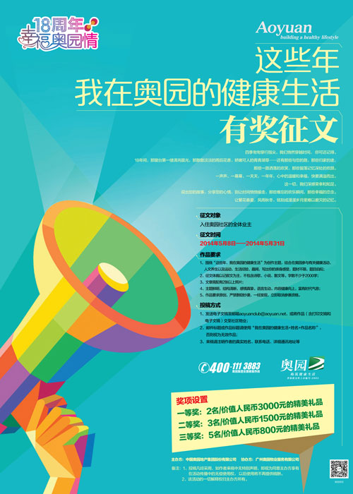 征文活動征集時間為2014年5月8日至5月31日,征文對象為奧園全體業主。征文作品要求圍繞“這些年,我在奧園的健康生活”為創作主題,結合在奧園參與有關健康活動、人文養生及運動、生活經驗、趣聞,寫出業主的親身感受,題材不限,題目自擬。征文體裁以記敘文為主,不包含詩歌、小說、散文等。字數不少于2000字。5月31日前,只要是奧園業主,發送電子文稿至郵箱aoyuanclub@aoyuan.net,或將作品(含打印文稿和電子文稿)交至社區物業,都有機會獲得3000元的獎金。大賽終評結果將于6月31日之前公布。